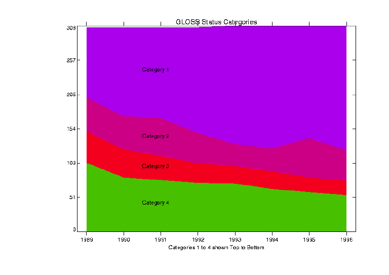Table 1 lists the number of stations which fall into each category for all stations, then for the subset which have been 'committed to GLOSS'. ('Committed to GLOSS' means that formal commitments have been made by national authorities to IOC to keep gauges operational). Also shown are the numbers in each category reported at previous GLOSS meetings with the category definitions adjusted backwards one, two, three etc. years appropriately.