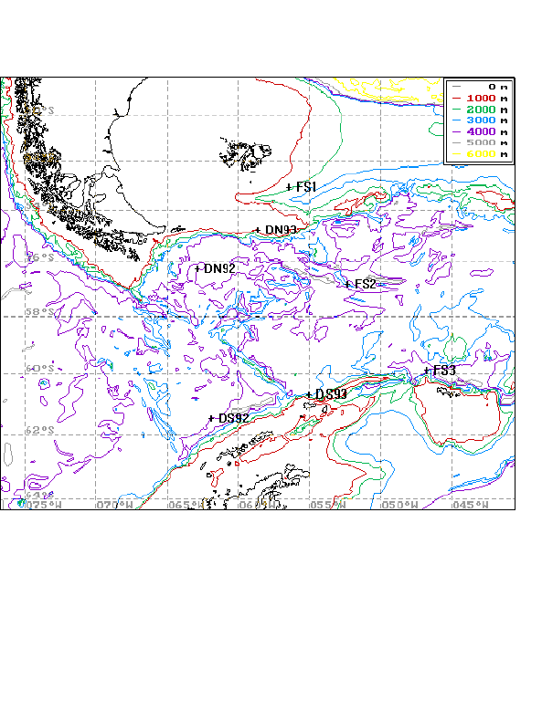 Six years of bottom pressure data have been used for the monitoring of the temporal variability of the Antarctic Circumpolar Current (ACC) transport at Drake Passage (DP). (Figure 1) shows the locations of the bottom pressure recorder (BPR) deployments. The FS1, FS2 and FS3 positions were first instrumented in November 1988, with the BPRs being moved to the DN93 and DS93 positions in November 1992, where monitoring continues. Additional bottom pressure data from the DN92 and DS92 positions were obtained for December 1991 to November 1992. (Figure 2) shows the currently available time series of bottom pressure from the north and south DP positions and north-minus-south pressure difference respectively, with the dashed line being the data smoothed with a 1 cycle/day cut-off low pass filter, and the solid line being the same data smoothed with a 31 day low-pass filter. Geostrophic calculations on these data yield values for the standard deviation in transport of approximately 8 Sv, subject to the assumption that the variability is predominantly barotropic (e.g. Vassie et al., 1994). This is slightly less than the 10 Sv obtained during the International Southern Ocean Studies (ISOS) programme in the mid-1970s to early 1980s (Whitworth and Peterson, 1985).