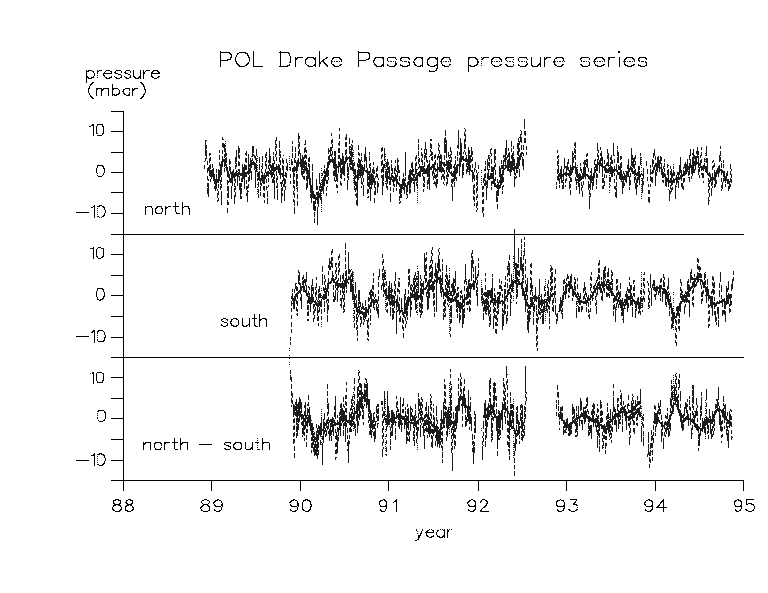 Since 1992, the DP BPR deployments have also featured Inverted Echo Sounders (IESs) on the instrument rigs. Data from these have been used to empirically obtain parameters such as dynamic height and vertically-averaged density at the north side of the passage, from which sea level can be obtained (Woodworth et al., 1995). No such derivation is possible for the south-side IES data, due to a non-linear relationship between measured acoustic travel time and the desired parameters. The IES data indicate that there is significant steric contamination in the BPR data from the north side of DP due to activity of the SubAntarctic Front (SAF), and consequently the north-minus-south pressure difference will overestimate the true transport variability. However, the fact that bottom pressure and acoustic travel time from north DP were observed to be negatively correlated implies that bottom pressure will provide a better measure of transport variability than sea level, since the change in density across the SAF partially compensates for the change in sea level.