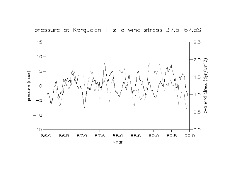 Figure 3b Zonally-averaged eastward wind stress between 37.5 and 67.5*S (solid), and bottom pressure measured at Kerguelen Island (dotted). Both series smoothed with 31-day moving average filter.